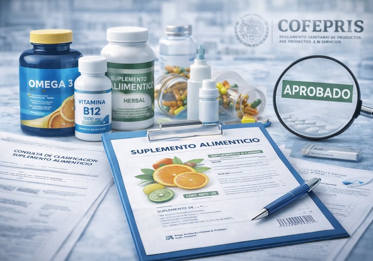 Gestionamos la consulta de clasificación de suplementos alimenticios y brindamos asesoría integral en la preparación y revisión del etiquetado, asegurando el cumplimiento de las normas, lineamientos y criterios vigentes de COFEPRIS, garantizando el cumplimiento regulatorio para su correcta comercialización en México